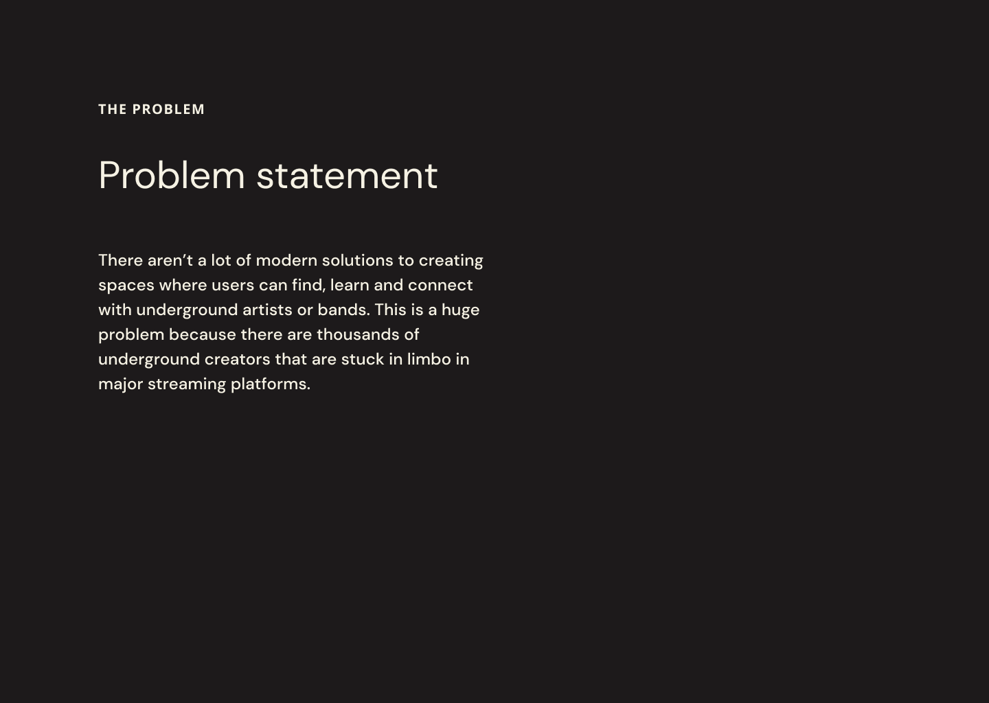 There aren't a lot of modern solutions to creating spaces where users can find, learn and connect with underground artists or bands. This is a huge problem because there are thousands of underground creators that are stuck in limbo in major streaming platforms.